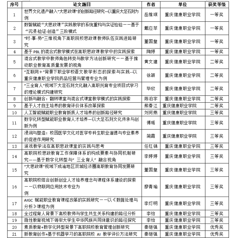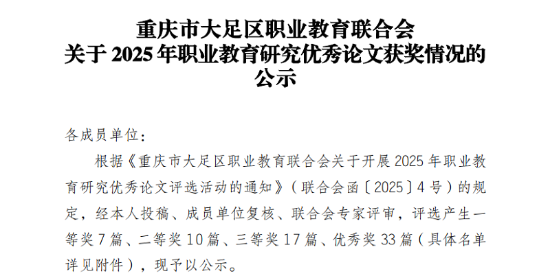 近日,重庆市大足区职业教育联合会正式发布《重庆市大足区职业教育联合会关于 2025 年职业教育研究优秀论文获奖情况的公示》,我校科研成果再传捷报!在本次评选中,我校教师凭借扎实的研究功底、创新的研究视角和紧密结合职业教育实践的研究内容,斩获各类奖项共计 44 项,其中一等奖 4 项、二等奖 5 项、三等奖 10 项、优秀奖 25 项,获奖数量与质量均位居前列,充分彰显了学校在职业教育研究领域的强劲实力与深厚积淀。