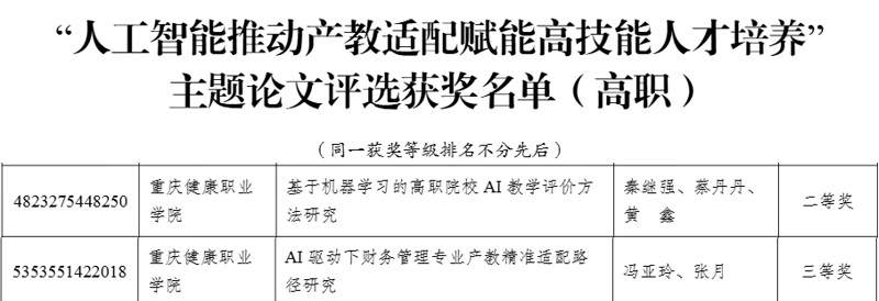 此次获奖不仅是对我校教师科研水平与应用研究能力的充分肯定,也是学校持续推进“人工智能+职业教育”融合发展、助力高素质技术技能人才培养的阶段性成果。学校将以此为契机,进一步鼓励和支持广大教师围绕人工智能赋能职业教育开展创新性研究与实践,总结提炼可推广、可复制的典型经验与模式,为服务重庆市职业教育高质量发展贡献更多“健康职院”智慧与力量。